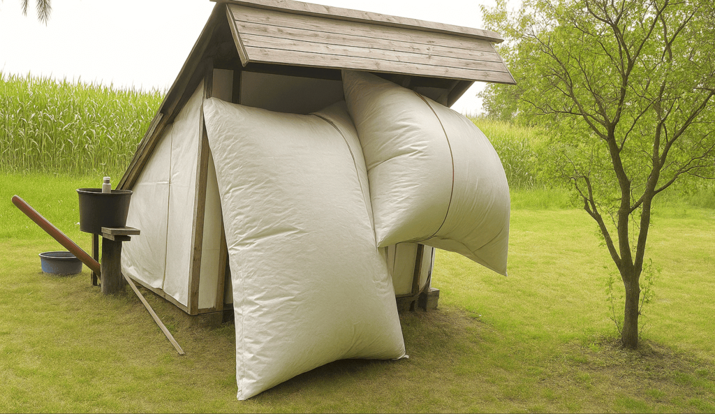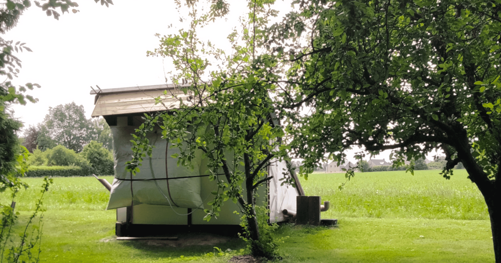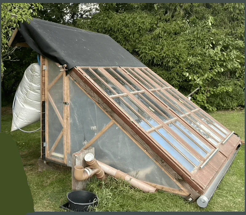 Les micro-unités de biométhanisation de Gas N’ Roses sont actuellement au stade pilote. L’installation repose sur un biodigesteur souple logé dans une petite serre et connecté à une poche souple pour le stockage du biogaz.