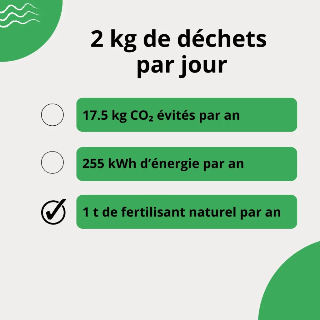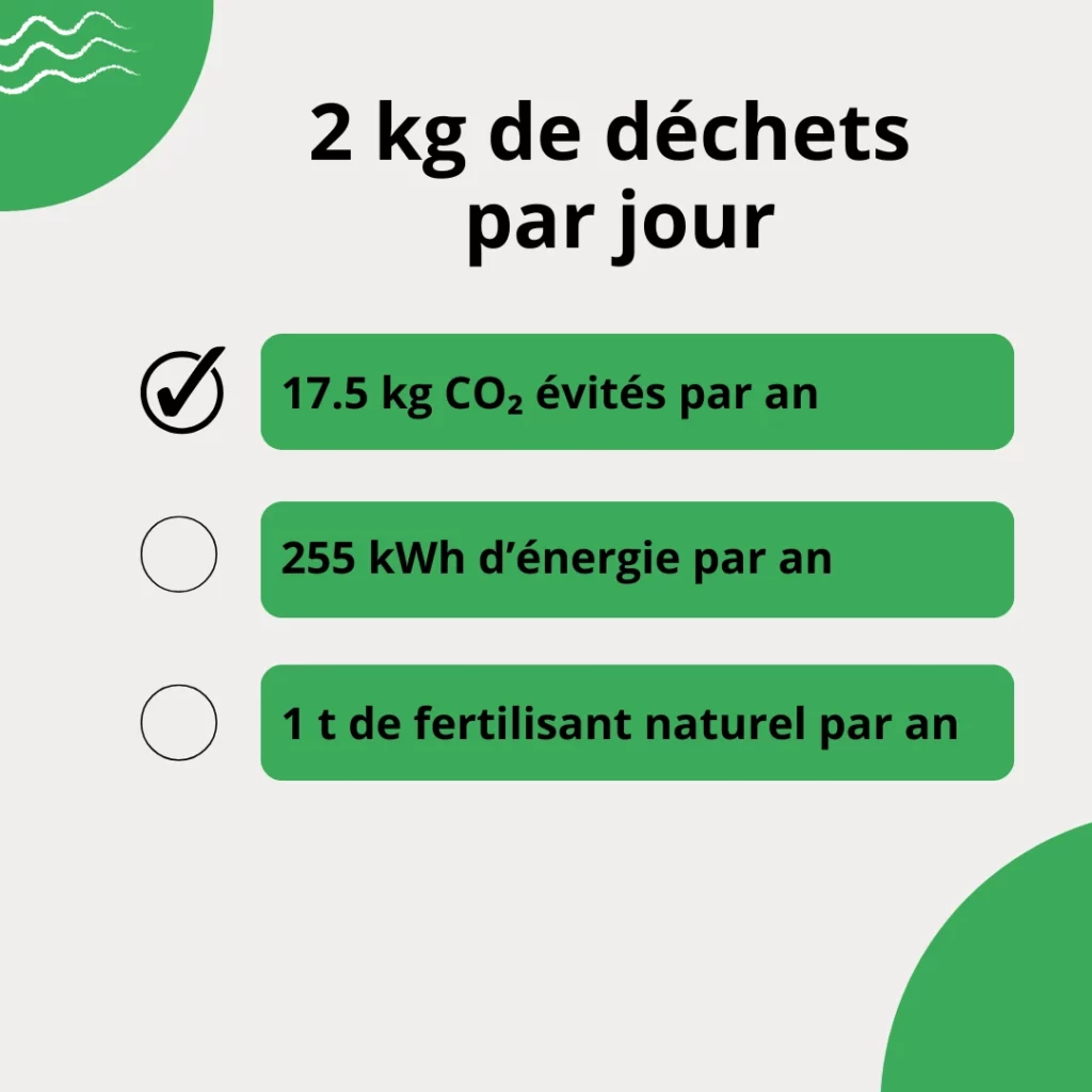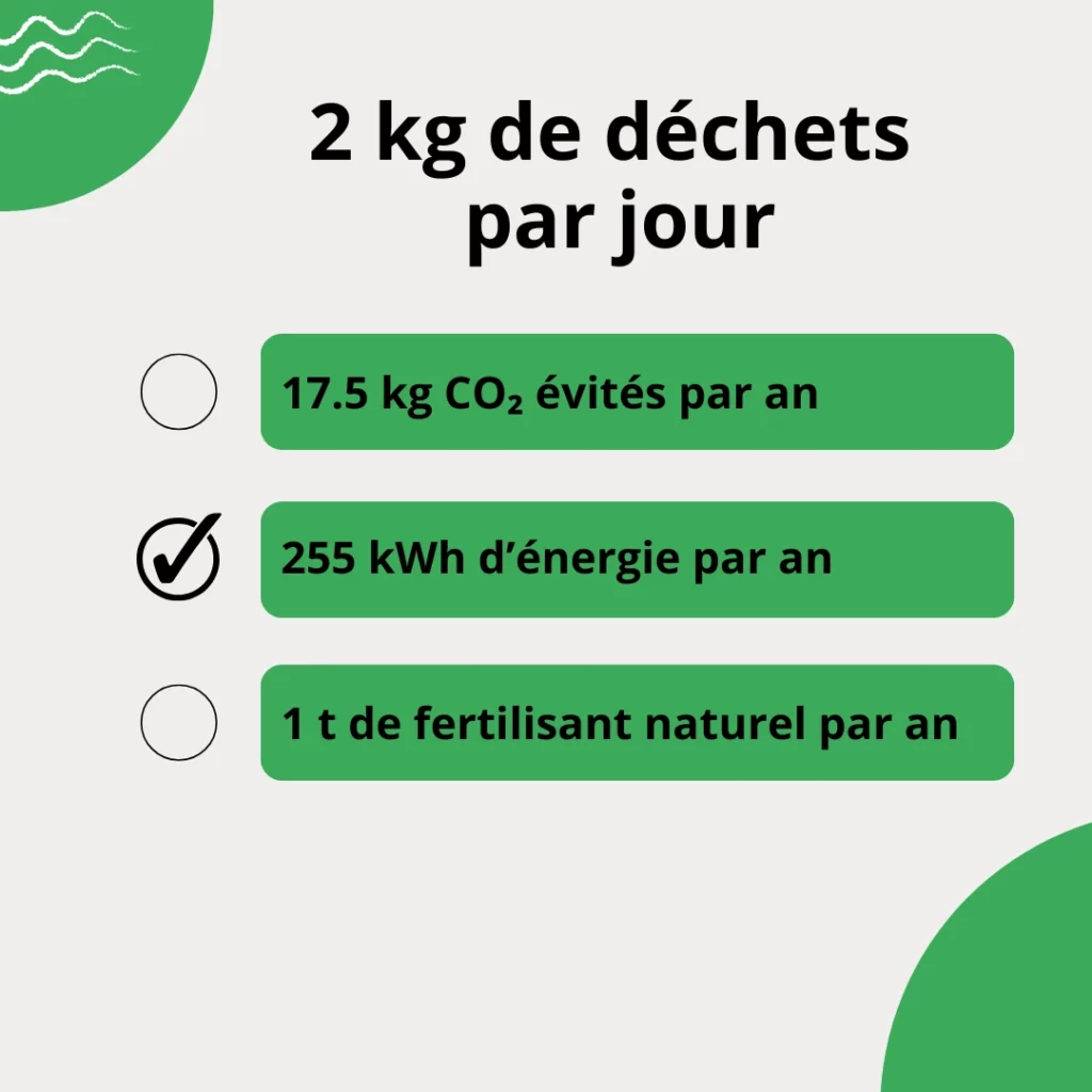 En remplaçant le gaz naturel d’origine fossile par du biogaz local, nous réduisons notre dépendance aux énergies fossiles importées. C’est une solution concrète pour renforcer notre autonomie énergétique. En valorisant 2 kg de déchets de cuisine par jour, on produit environ 255 kWh/an.